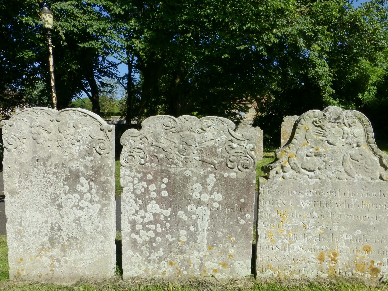 Leaning against the church wall, directly behind you from the Tolquhon Tomb, are 4 old grave slabs dating from the 1580s to 1630s, with wonderfully naive skulls on them, and inscriptions which remain legible to this day.
